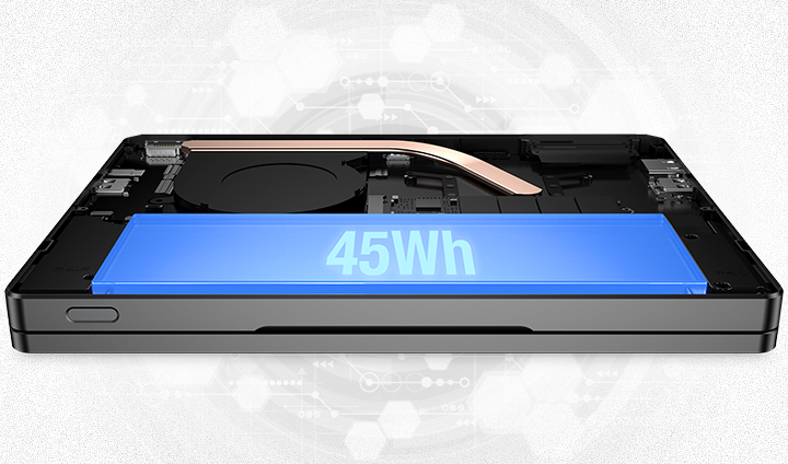 The 45Wh battery features 100W PD fast charging, reaching 50% in 30 minutes. Direct motherboard power delivery ensures stable performance for your AI tasks anytime.